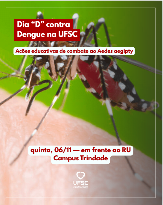 Na próxima quinta-feira, 6 de novembro de 2025, a Universidade Federal de Santa Catarina (UFSC) realizará uma ação de conscientização sobre a prevenção à dengue, em alusão ao Dia Nacional D de Combate à Dengue, celebrado no sábado, dia 8 de novembro.